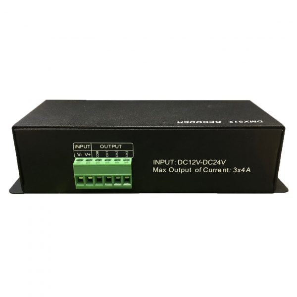 Denna DMX512 decoder erbjuds för att styra produkter (oftast LED strip eller wall washer eller liknande) med RGB 12/24VDC. Max belastning 12V 144W (går även med 24VDC, då max 288W)